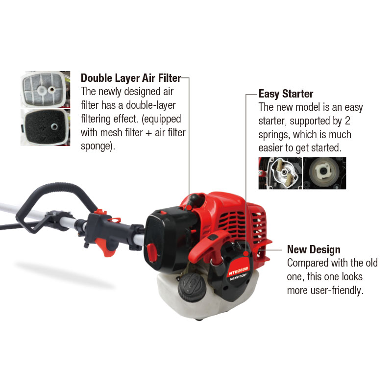 The NEWTOP Brush Cutter NTB260B is built for enhanced efficiency and ease of operation. Its upgraded double air filter system and spring-assisted recoil start deliver smoother ignition and longer service intervals. Perfect for professionals looking for reliable gasoline brush cutters and grass trimmers on sale from leading brush cutter suppliers and garden machinery manufacturers.