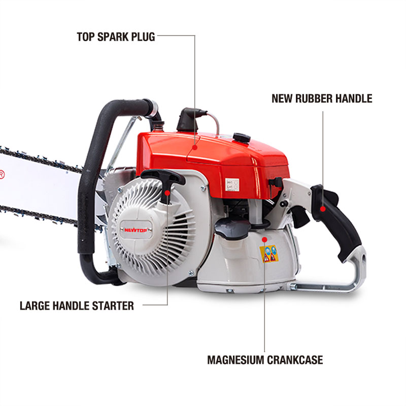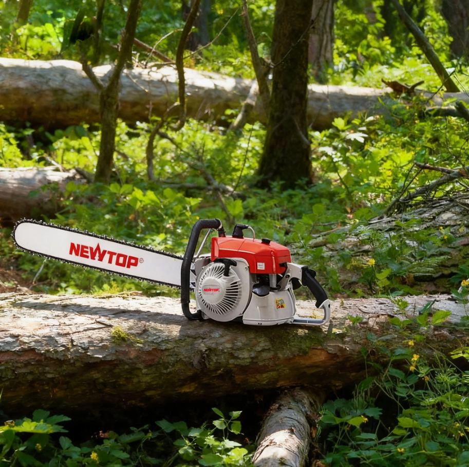 The portable NEWTOP Chainsaw NT10500 for Home and Professional Use. Offering high power and reliability, this chainsaw is perfect for both professional and DIY tasks. It features a magnesium crankcase for improved shock absorption and cooling, along with a large handle starter for easy ignition, making it ideal for extended use with low noise and emissions.