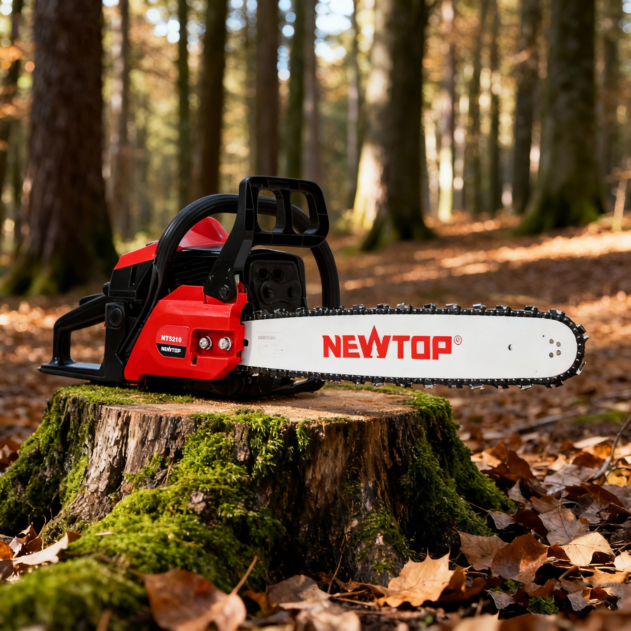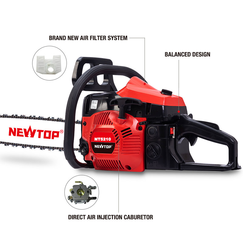 The NEWTOP Chainsaw NT5210 is designed for power and reliability in outdoor environments. Featuring a direct-injection carburetor and a brand-new air-filter system, it ensures clean airflow and smooth performance. Ideal for professionals seeking durable gasoline chainsaws from trusted chainsaw manufacturers and chainsaw dealers worldwide.