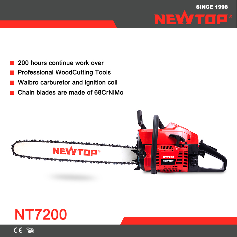 The NEWTOP Chainsaw NT7200 is engineered for heavy-duty outdoor work, delivering stable power, durability, and efficiency. Equipped with a WALBRO ignition coil and carburetor, it ensures reliable ignition and smooth power output. Its forged crankshaft offers exceptional strength, while the fuel-efficient engine and ergonomic handles reduce fatigue and emissions.