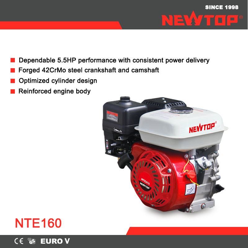 The NEWTOP NTE160 offers a reliable balance of power and efficiency for a wide range of light- to medium-duty applications. With a 5.5HP output, this engine ensures smooth performance and stable torque delivery. It combines a high-strength forged crankshaft, a patented cylinder design, and a reinforced engine casing to deliver excellent durability and vibration resistance. Designed for easy starting and steady operation, the NTE160 maintains consistent performance even in demanding environments.