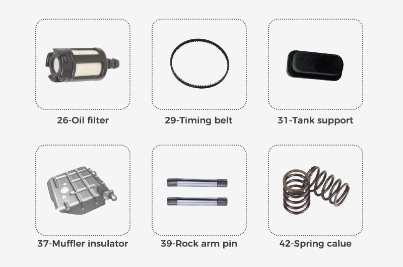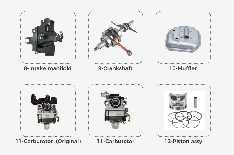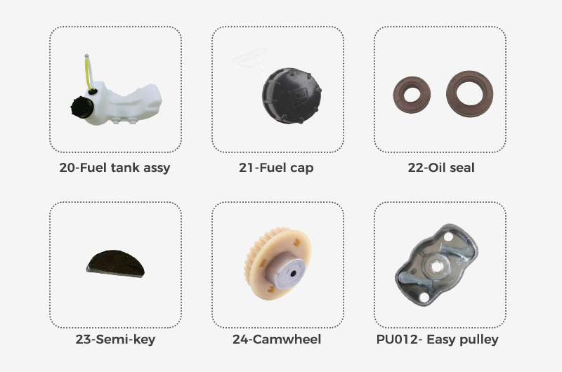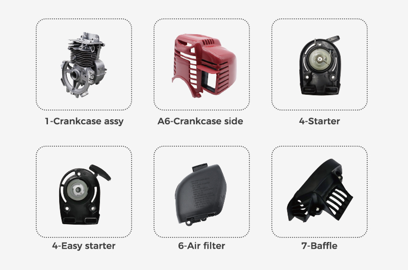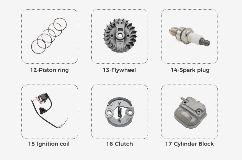 Protective and external parts use reinforced materials to withstand abrasion, heat, and outdoor exposure, while key functional parts—such as ignition-related components, clutch assemblies, and gearbox parts—are designed for steady engagement and reliable torque delivery. This balanced configuration supports efficient cutting performance and reduces unplanned downtime.